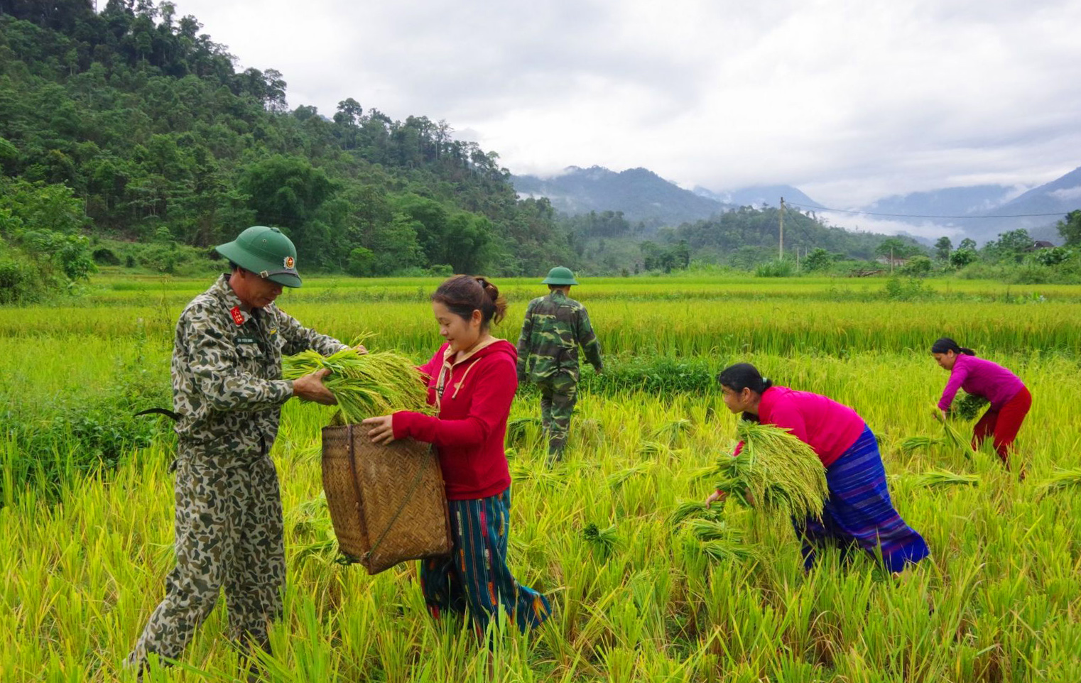 Cán bộ, chiến sĩ Bộ Chỉ huy Quân sự tỉnh Nghệ An giúp nhân dân xã Nậm Giải, huyện Quế Phong thu hoạch lúa_Nguồn: laodong.vn