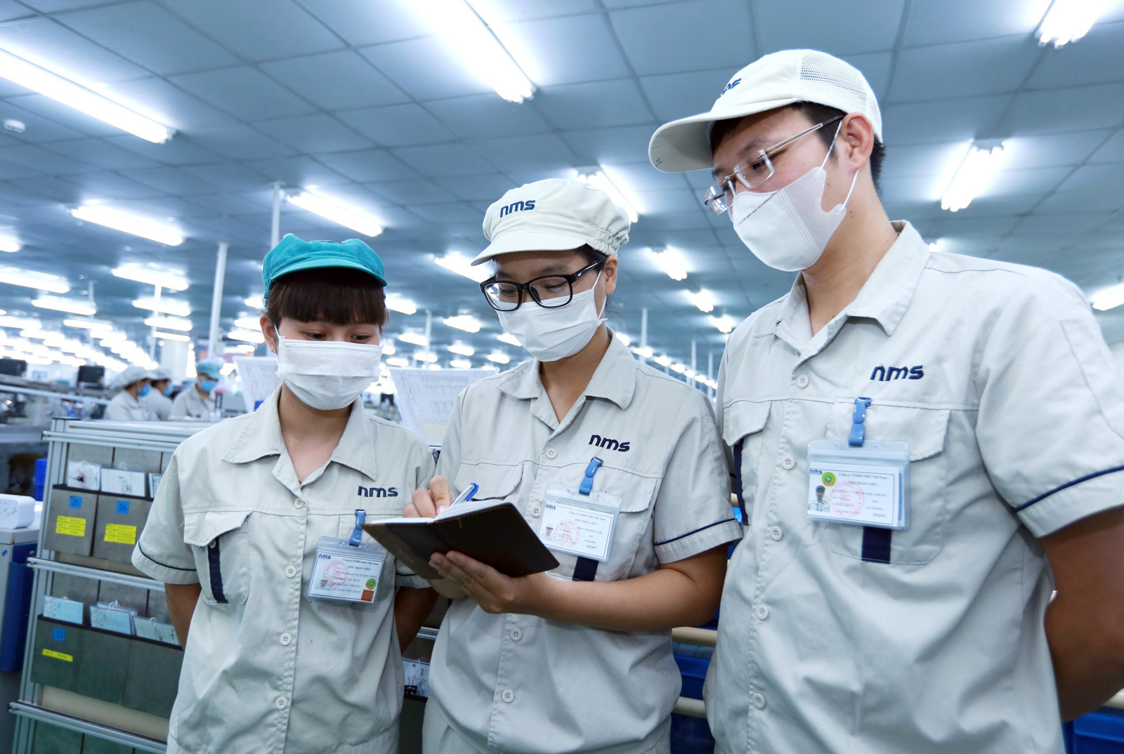 Đồng chí Trần Thị Phúc Lộc (đứng giữa), 5 năm tuổi đảng (Công ty TNHH NMS Việt Nam, vốn đầu tư của Nhật Bản, tại Khu công nghiệp Đồng Văn II, tỉnh Hà Nam) hướng dẫn công việc cho 2 đảng viên dự bị_Ảnh: TTXVN