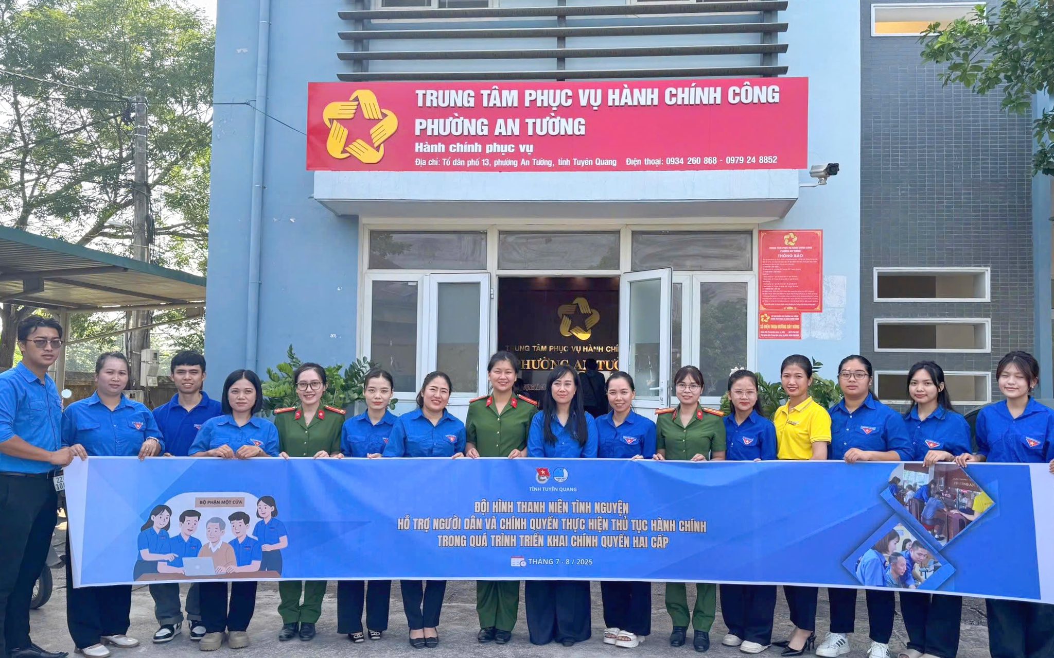 Đội hình thanh niên tình nguyện hỗ trợ người dân và chính quyền thực hiện thủ tục hành chính trong quá trình triển khai chính quyền 2 cấp của Đoàn TNCS Hồ Chí Minh phường An Tường