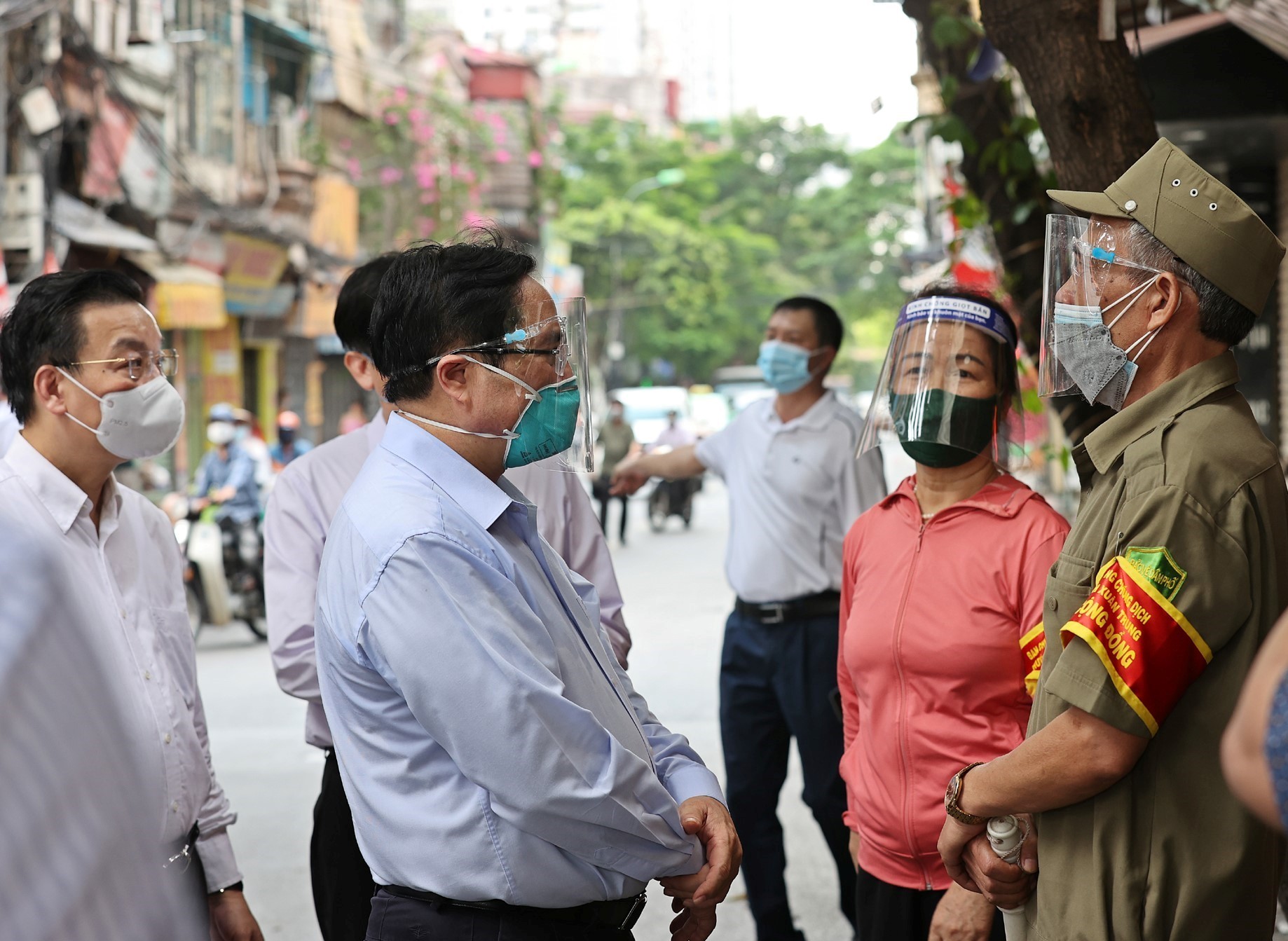 Ủy viên Bộ Chính trị, Thủ tướng Chính phủ Phạm Minh Chính động viên lực lượng phòng, chống dịch COVID-19 tại chốt kiểm dịch trên đường Nguyễn Tuân, quận Thanh Xuân, thành phố Hà Nội_Nguồn: TTXVN