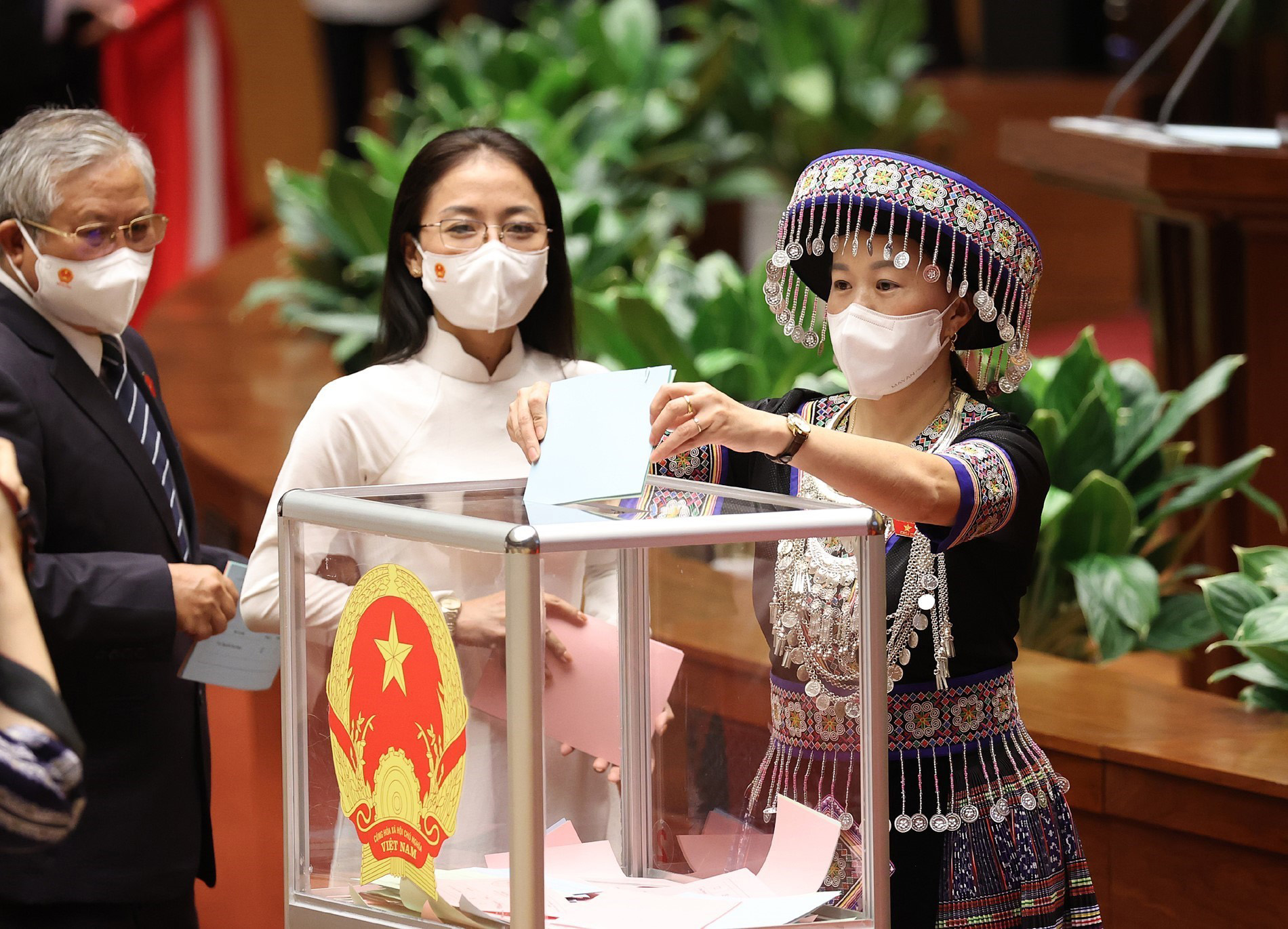 Các đại biểu Quốc hội bỏ phiếu phê chuẩn việc bổ nhiệm nhân sự Thẩm phán Tòa án nhân dân tối cao tại Kỳ họp thứ nhất, Quốc hội khóa XV _Ảnh: TTXVN