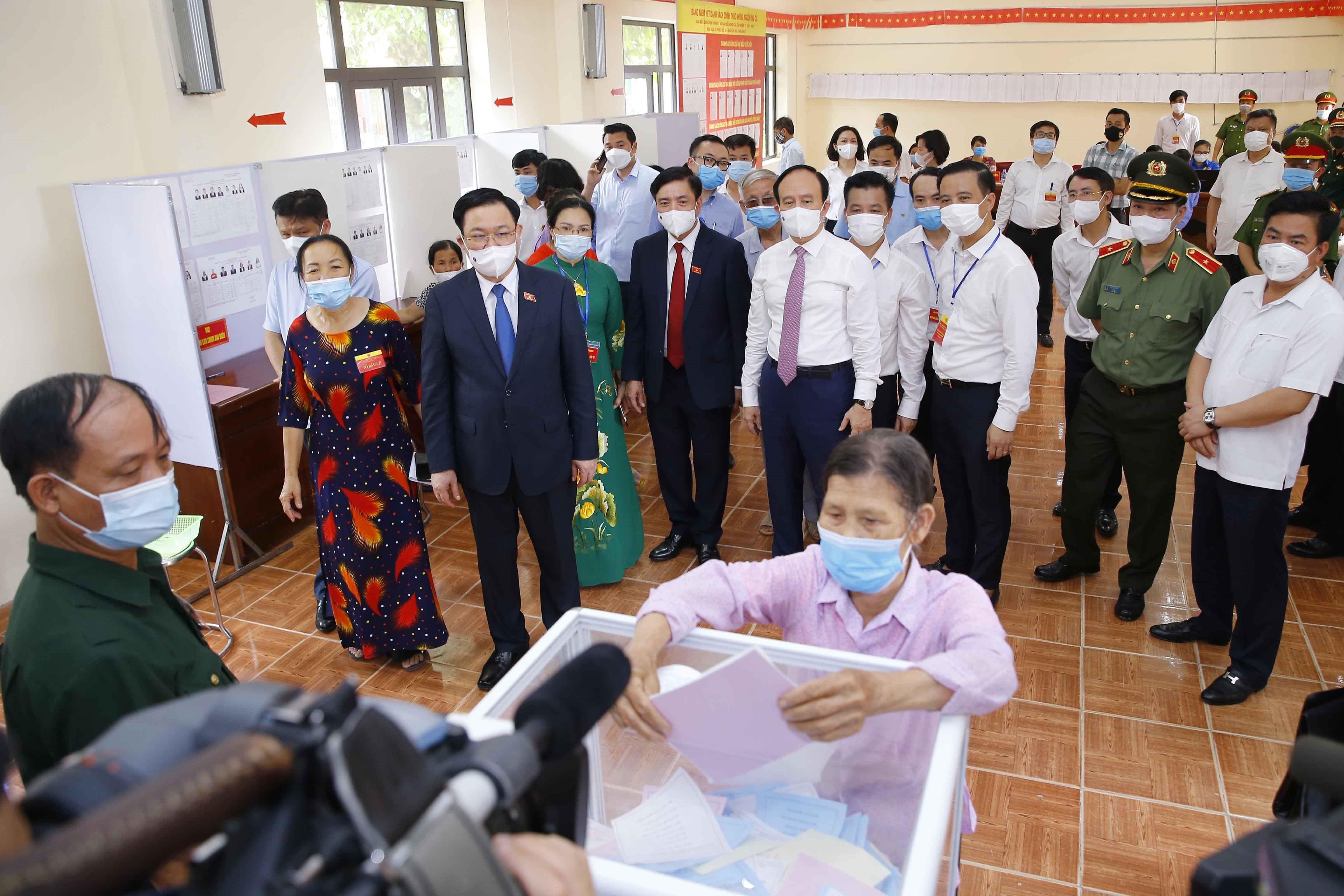 Ủy viên Bộ Chính trị, Chủ tịch Quốc hội Vương Đình Huệ chứng kiến cử tri bỏ phiếu tại khu vực bỏ phiếu số 8, xã Kim Chung, huyện Đông Anh, thành phố Hà Nội_Ảnh: TTXVN