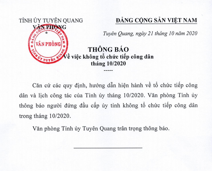Thông báo về việc không tổ chức tiếp công dân của người đứng đầu cấp ủy tỉnh Tuyên Quang tháng 10/2020