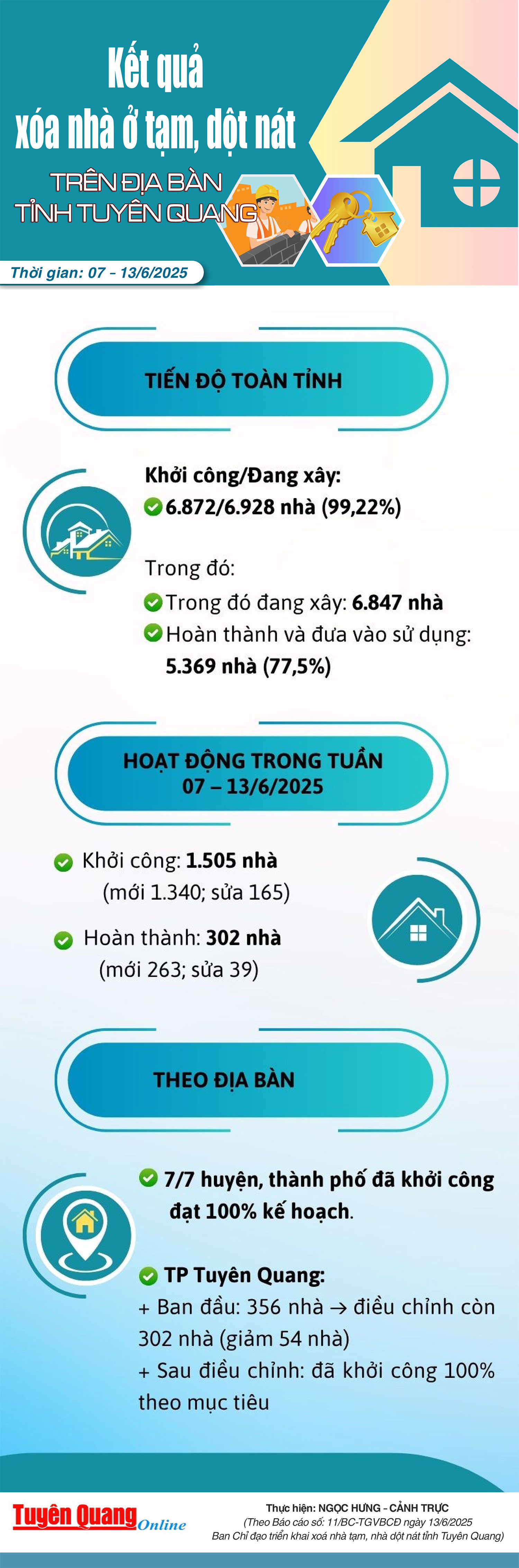 Tính đến ngày 13/6/2025, các huyện, thành phố đã chỉ đạo các thành viên ban chỉ đạo cấp huyện phối hợp với cấp xã vận động hộ gia đình thực hiện công tác xoá nhà tạm, dột nát trên địa bàn tỉnh Tuyên Quang là: 6.872 nhà/6.928 nhà đạt 99,22% kế hoạch.
