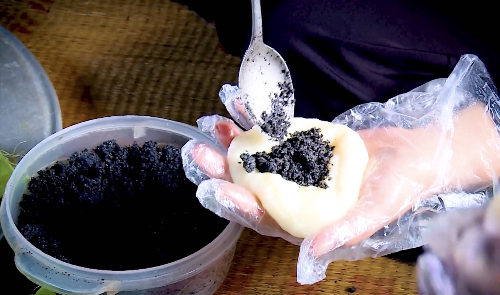 Muốn bánh ngon phải giã nhanh và đều tay, thường xuyên quần đảo cho khỏi dính. Xôi nếp sau thời điểm giã nhuyễn, nặn ra từng vắt bột dẻo dai, mềm mịn. Dàn đều nắm bột, rồi cho thêm nhân vừng đen vào vê tròn lại. Quy trình tiến độ nặn bánh phải thật nhanh để vỏ bánh không bị cứng, nhân bánh cũng không bị khô. Thường trước khi nặn bánh, người Tày dùng “lạp” - làm từ sáp ong xoa đều bàn tay để tránh bị dính. Từng chiếc bánh thành phẩm được người làm đặt cẩn thận vào lá chuối rừng tươi sau thời khi đã rửa sạch, hơ lửa để giúp bánh được mềm lâu, mặt bánh không bị se.