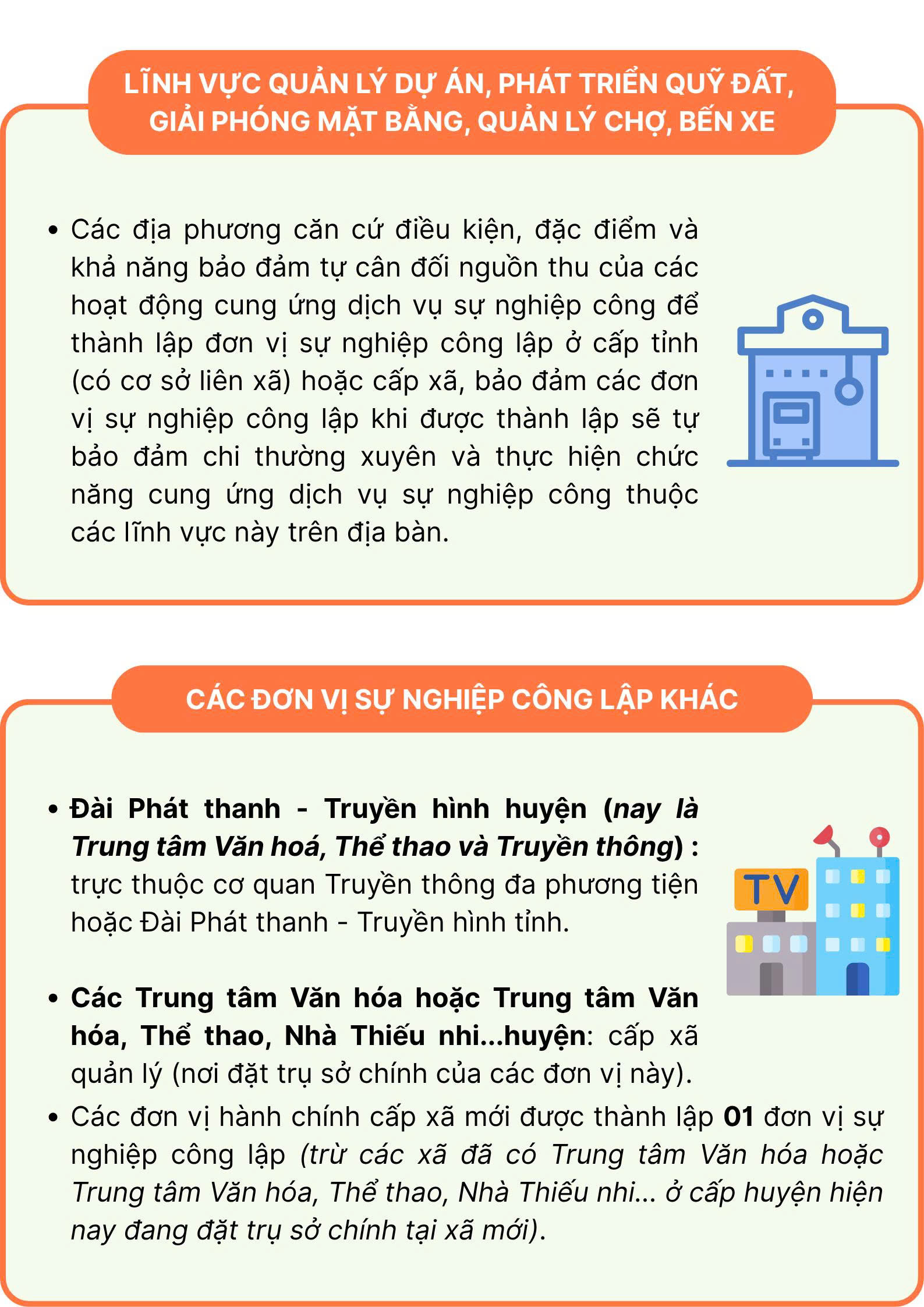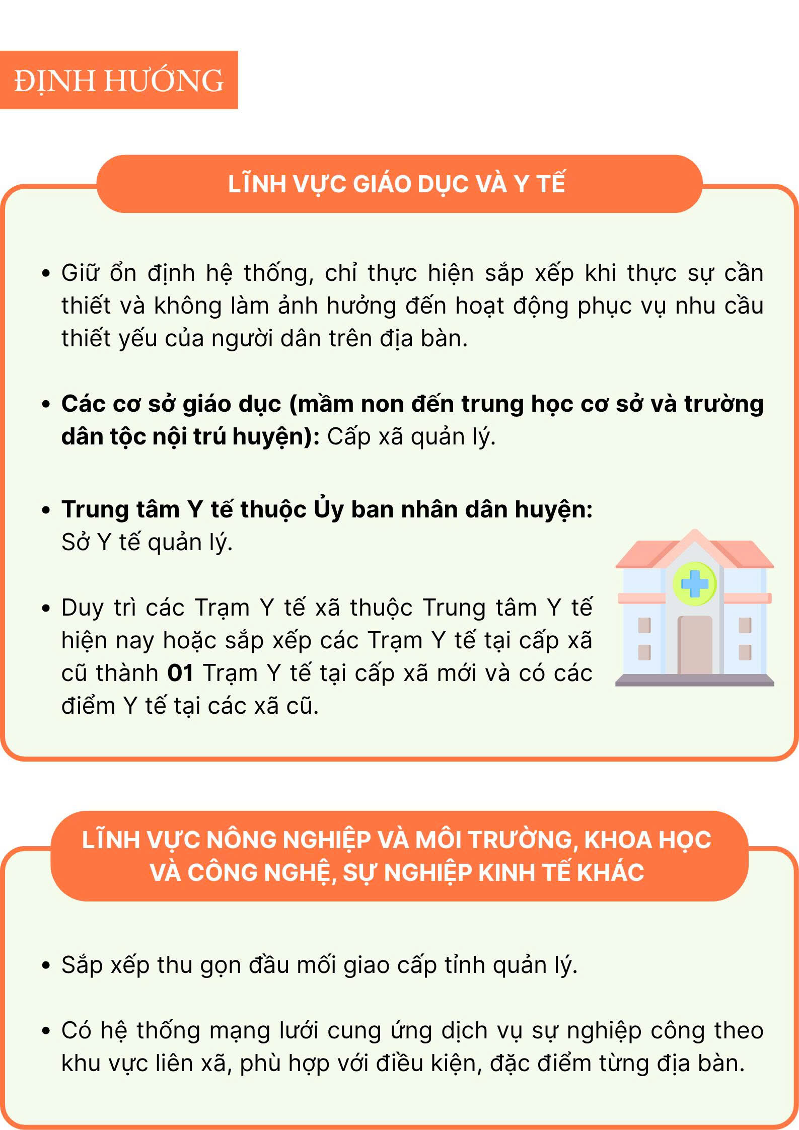 Ngày 28/5/2025, Ban chỉ đạo sắp xếp ĐVHC các cấp và xây dựng mô hình tổ chức CQĐP 02 cấp ban hành Công văn số 68/CV-BCĐ về việc định hướng sắp xếp, tổ chức lại đơn vị sự nghiệp công lập ở địa phương khi thực hiện mô hình tổ chức chính quyền địa phương 02 cấp như sau: