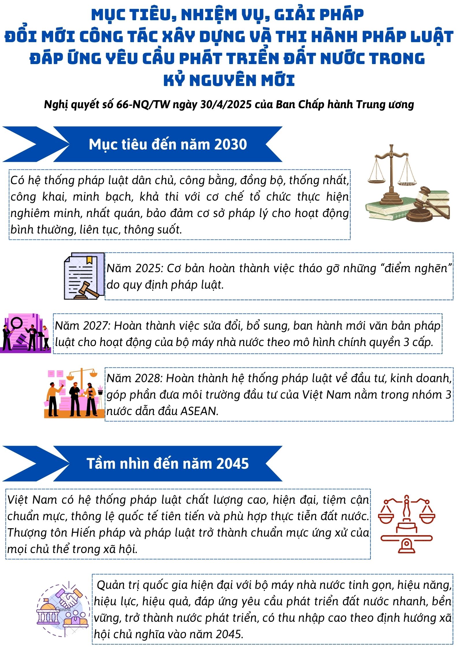 Ngày 30/4/2025 Ban Chấp hành Trung ương ban hành Nghị quyết số 66-NQ/TW về đổi mới công tác xây dựng và thi hành pháp luật đáp ứng yêu cầu phát triển đất nước trong kỷ nguyên mới với mục tiêu, nhiệm vụ, giải pháp sau: