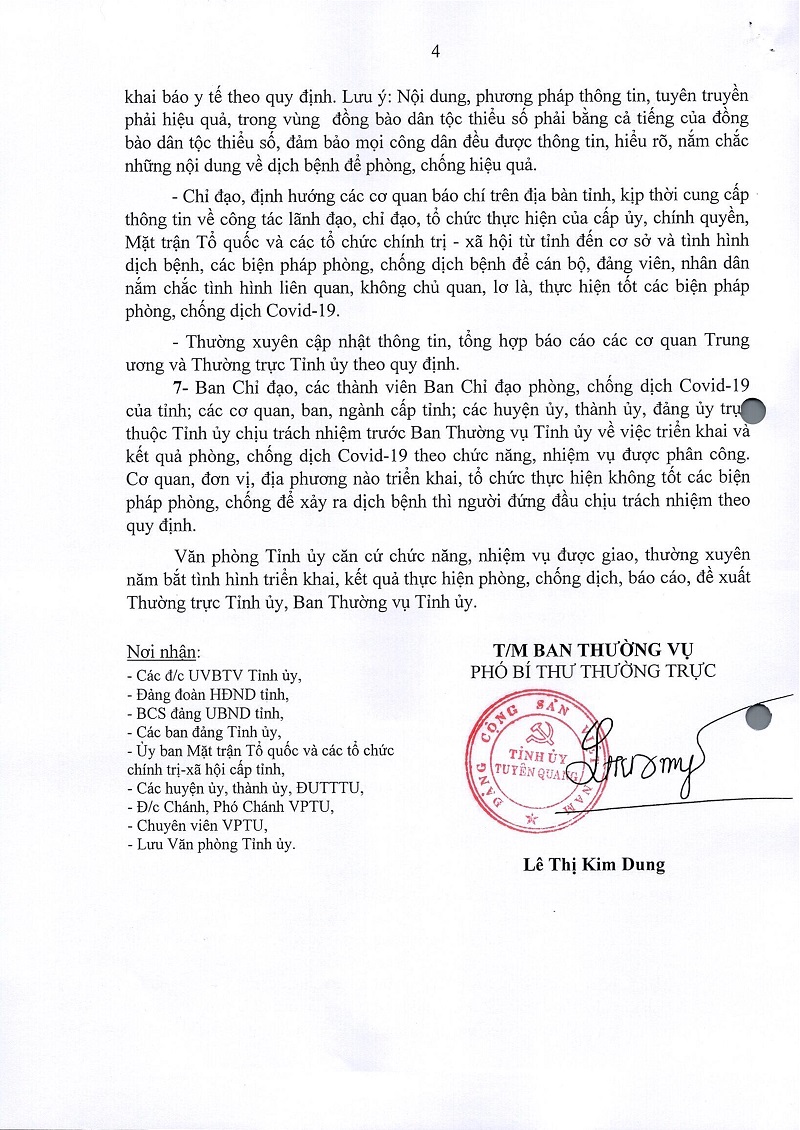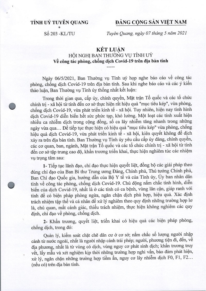 Vừa qua, Tỉnh ủy Tuyên Quang vừa có Kết luận số 203-KL/TU ngày 07/5/2021 Kết luận Hội nghị Ban Thường vụ Tỉnh ủy về công tác phòng, chống dịch Covid-19 trên địa bàn tỉnh, Ban Biên tập Cổng thông tin điện tử Đảng bộ tỉnh trân trọng giới thiệu toàn văn Kết luận