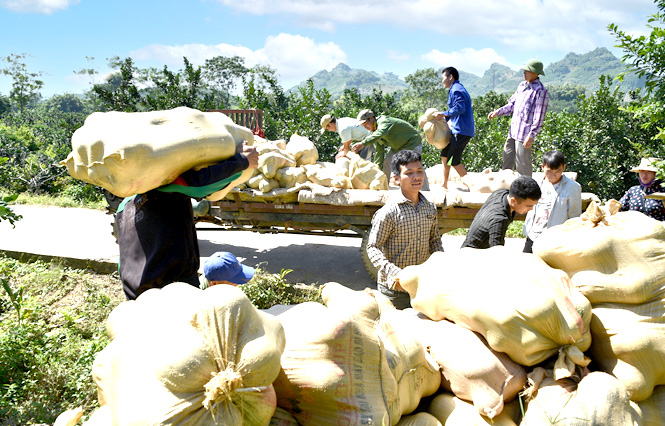 Các lái buôn vào vùng chuyên canh bưởi bốc hàng chở về xuôi tiêu thụ.