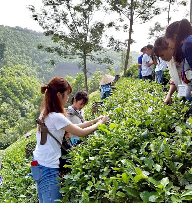 Du khách tham quan trải nghiệm tại đồi chè Vĩnh Tân, xã Tân Trào (Sơn Dương).