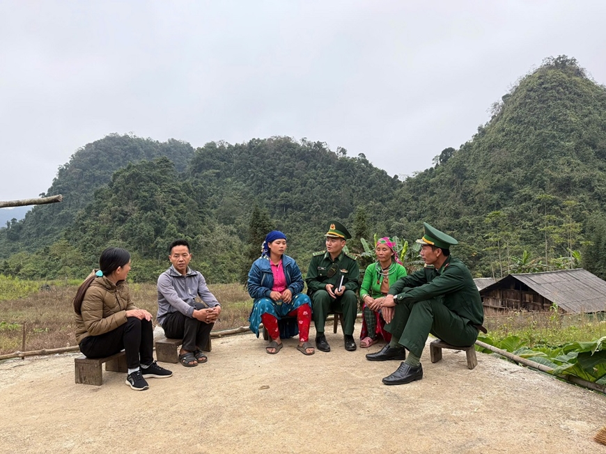 Cán bộ, chiến sĩ Đồn Biên phòng Sơn Vĩ phối hợp cùng các ban, ngành đoàn thể xã Sơn Vĩ tuyên truyền pháp luật về đường biên, mốc giới cho nhân dân xã Sơn Vĩ.