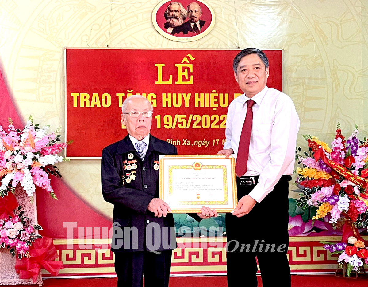 Đồng chí Chủ nhiệm UBKT Tỉnh ủy Nguyễn Hồng Trang trao Huy hiệu 60 năm tuổi Đảng cho đồng chí Lê Ngọc Vũ, Chi bộ thôn Nam Ninh, Đảng bộ xã Bình Xa.