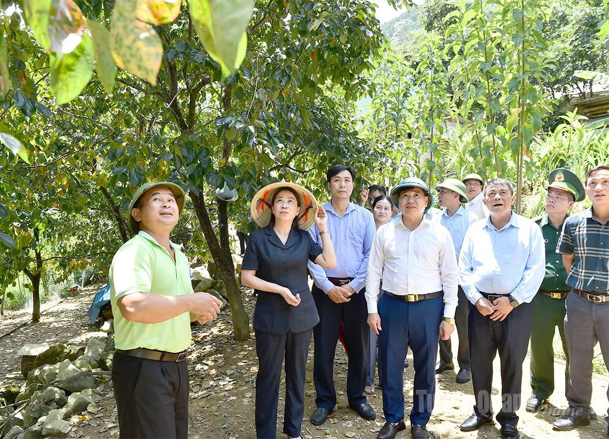 Đồng chí Lễ Thị Kim Dung, Phó Bí thư Thường trực Tỉnh ủy và đoàn công tác thăm mô hình trồng hồng không hạt tại thôn Phín Ủng, xã Nghĩa Thuận.