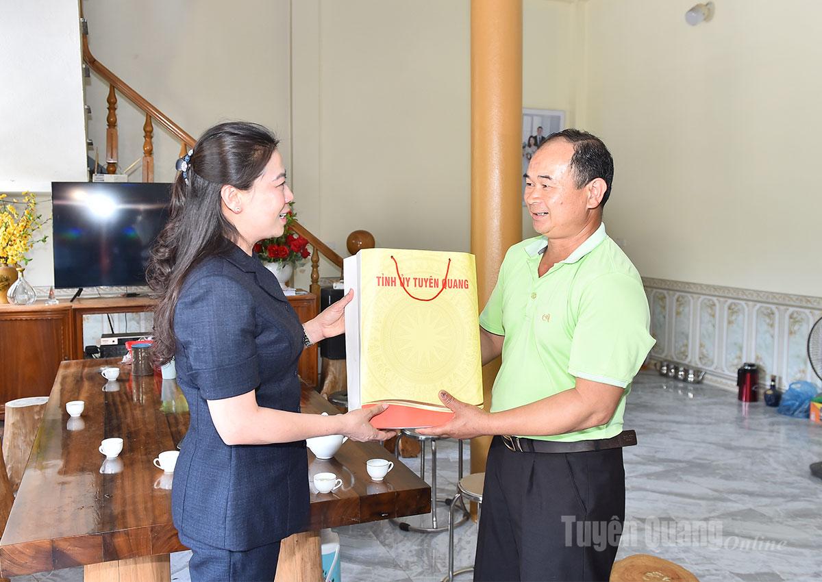 Đồng chí Lễ Thị Kim Dung, Phó Bí thư Thường trực Tỉnh ủy tặng quà gia đình anh Vương Trung Hùng, thôn Phín Ủng, xã Nghĩa Thuận.