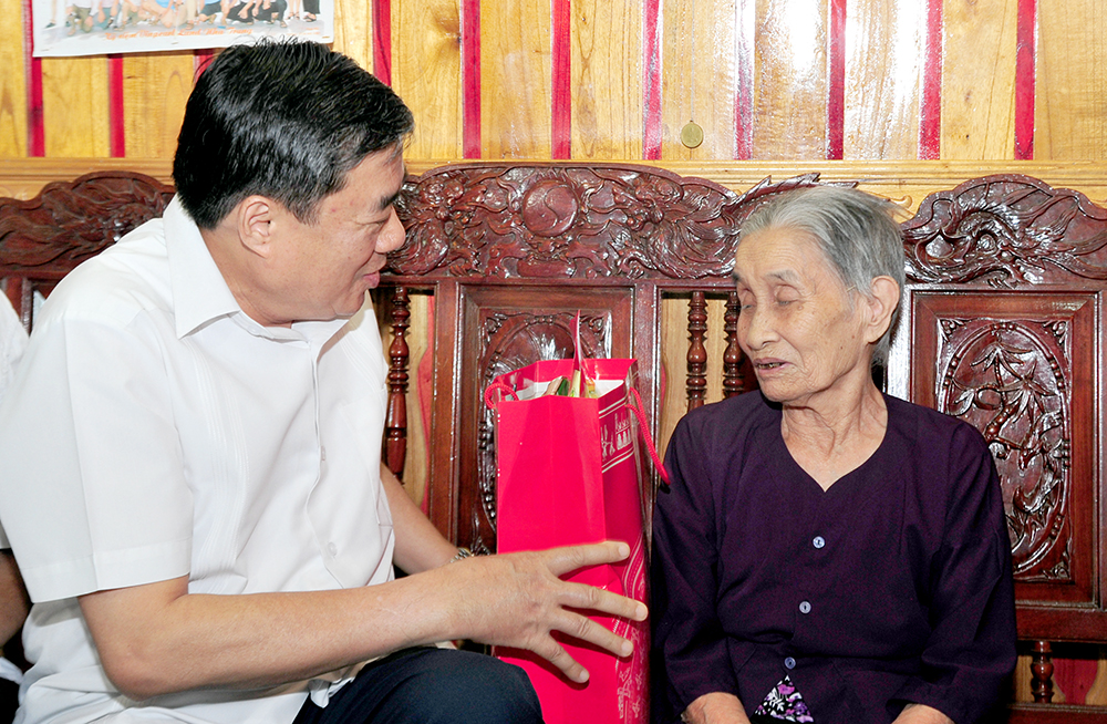 Đồng chí Phó Bí thư Thường trực Tỉnh ủy Nguyễn Hồng Thắng tặng quà cụ Phạm Thị Xen,