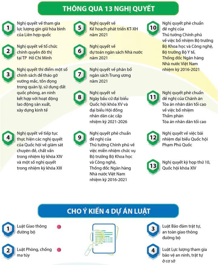 Ngày 20/10/2020, Kỳ họp thứ 10, Quốc hội khóa XIV đã khai mạc trọng thể tại Nhà Quốc hội, Thủ đô Hà Nội. Kỳ họp diễn ra trong thời gian 18 ngày và được chia thành 2 đợt, kết hợp giữa họp trực tuyến và họp tập trung. Với tinh thần làm việc khẩn trương, nghiêm túc, đoàn kết, đồng thuận cao, Quốc hội đã hoàn thành toàn bộ chương trình kỳ họp, kết quả như sau: Quốc hội đã thông qua 07 luật, 13 nghị quyết, cho ý kiến về 04 dự án luật; giám sát việc thực hiện các nghị quyết của Quốc hội về giám sát chuyên đề, chất vấn trong nhiệm kỳ khóa XIV và một số nghị quyết trong nhiệm kỳ khóa XIII (chất vấn và trả lời chất vấn); xem xét, quyết định các vấn đề kinh tế - xã hội, tài chính, ngân sách, nhân sự; thảo luận, góp ý kiến vào các dự thảo văn kiện trình Đại hội Đại biểu toàn quốc lần thứ XIII của Đảng; xem xét các báo cáo kiến nghị của cử tri, công tác tư pháp, phòng, chống tội phạm và vi phạm pháp luật, thi hành án, phòng, chống tham nhũng và một số báo cáo quan trọng khác.