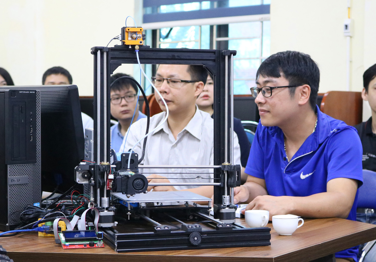 Giáo viên công nghệ tham gia tập huấn thiết kế sản phẩm, thực hành in 3D trực tiếp trên máy tại phòng chức năng STEM Lab tại Đại học kỹ thuật công nghiệp Thái Nguyên_Ảnh: TTXVN