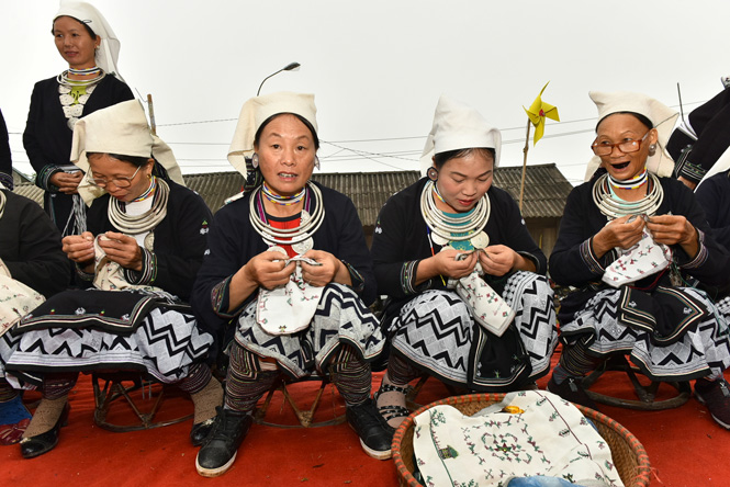 Câu lạc bộ thêu trang phục Dao Tiền thôn Khau Tràng, xã Hồng Thái (Na Hang).